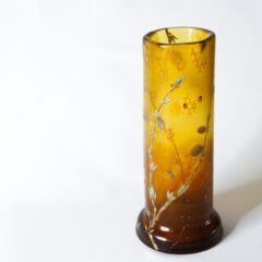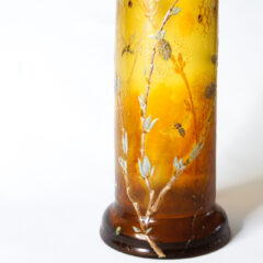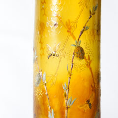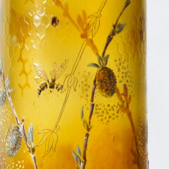 とろりと濃厚な蜂蜜を思わせる琥珀色の色ガラスを用い、蜜蜂と猫柳をエナメル彩で描いた早春を表現したと思われる作品。植物や昆虫に造詣の深いガレならではのこだわりが詰まった良作です。初めに目を惹くのは花瓶全体に施された蜂の巣をイメージしたモチーフ。エッチングとエナメル彩を駆使して装飾されています。技法を組み合わせることで画一的な表現とならず、ガレ特有の仕上がりとなっています。猫柳と蜂は肉厚のエナメル彩で描かれていますが、蜂の羽は透明感を出すために薄手の白色のエナメル彩で仕上げられています。
