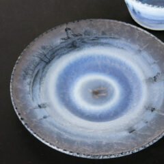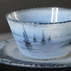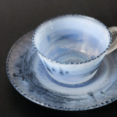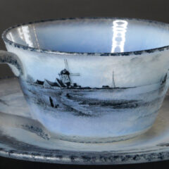 ドームのオランダ風景シリーズのカップ&ソーサーが入荷しました。マーブルガラス仕上げ特有の淡い乳白のガラスベースに、黒のエナメル彩色の濃淡で水墨画のように風車や湖水風景、帆船や人物像が仔細に描かれています。ガラスの濃淡の境目で空と湖水の境目を表現し、遠近法を取り入れることで奥行きのある構図に仕上がっています。小品ながらも見ごたえのある作品です。
