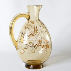 - アンバー色ガラス、型吹き成型、アプリカッション(ハンドル)、エナメル彩、金彩