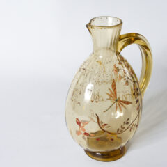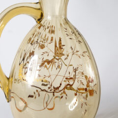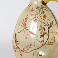 初期のガレ作品に該当するアンバーガラスを用いた水差し。エナメル彩で蜉蝣(カゲロウ)と草花が描かれたジャポニズムスタイルの作品。ガレの作品は「ものいうガラス」とも言われ様々なメッセージが込められた作品が存在します。羽化すると僅か数時間で死んでしまう蜉蝣の命のはかなさと、命の移ろい(幼虫は水生~成虫は羽虫)を作品に封じ込めたお品ではないでしょうか。