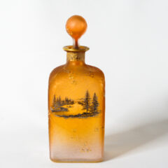 針葉樹林に囲まれた静かな湖に船を浮かべた様が描かれたリキュールボトル。針葉樹林の質感やボートに乗る男性(ハットをかぶっているように見えます)までもが黒一色の墨絵のようなエナメル彩で細かに描き込まれています。ただ単にエナメル彩で絵付けをするだけでなく、ガラスの質感を交えて表現することで、非常に奥行きのある絵柄に仕上がっています。ボトル全体は霧氷紋(ジヴレ)によるザラリとした仕上げですが、湖面はエッチング剤を使用せずクリアに表現されています。平坦な絵付けだけでなく、ガラスの質感変化を交えた表現はドーム社ならではの仕上げでしょう。