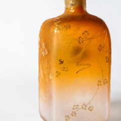 オレンジの色ガラスと透明ガラスを組み合わせたやわらなか印象を受ける作品です。合間に彫り込まれた草花のアクセントも良い味を出しています。ボトル裏面にはLouiseという刻印が入っています。フランスの修道女であった''Louise de Marillac''にちなむものなのか、名高き戦士を意味する単語なのか、想像は膨らみます。