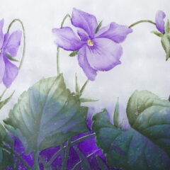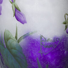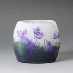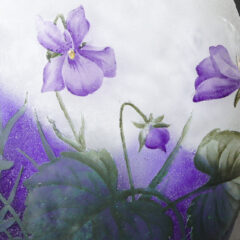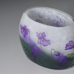 ドームのスミレモチーフの扁壺型の花瓶が入荷しました。発色の良い紫と白のマーブルガラス地に、エッチング(酸化腐食彫り)で図柄を浮かび上がらせた後、エナメル彩でスミレが描かれています。腕利きのぺインターの仕上げだったのでしょう、花弁の質感も非常に丁寧に表現されています。サインは作品の胴部にエッチングでDaum Nancy ロレーヌクロスと入っています。