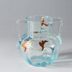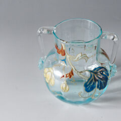 ガレの小型で愛らしい双耳型の花瓶が入荷しました。デフォルメされた花のモチーフが全体にあしらわれ、白、臙脂、ブルー系統のエナメル彩で描かれています。特にブルー系のエナメルの発色が良く、全体の良いアクセントになっています。