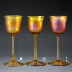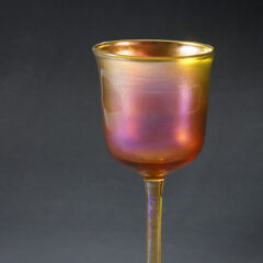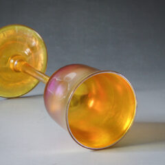 同時期に入荷した花瓶や装飾鉢とは仕上げが少し異なり、極厚のラスター彩ながらどこか透明感のある仕上がり。ボール部とフット部のガラス表面はガラス素地のままで、内側にのみラスター彩が施されているからです。以前入荷のあった同形状のグラスシリーズも同様の仕上げであったことからドリンキンググラスはこの仕上げであることが推測できます。