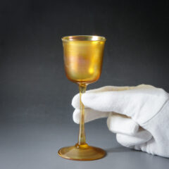 ゴールドからパープル、ブルーへと、光を受けて煌めくグラデーションが美しい。ポルトワイン用の小ぶりなグラスで容量は 60 ㎖ほど。冷酒やリキュールにもお使いいただけます。