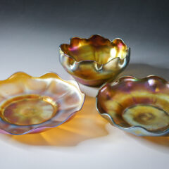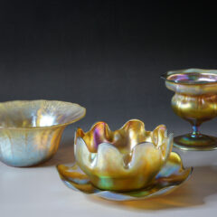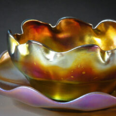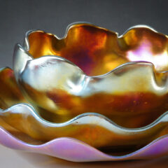 異なる色のガラスが溶け合い混ざり合うファブリルガラス作品は、魅惑的で複雑な表情を私たちに見せてくれます。「ファブリルガラスは、華やかで深みのある色彩、まるでアメリカの蝶の羽、鳩や孔雀の首、カブトムシの羽のような虹色を持っている。」-ルイス・C・ティファニー
