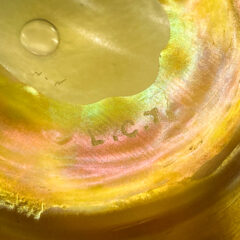玉虫色に変化する金属質な光沢と、ガラスならではの透明感を併せ持った特殊なガラスで制作されています。