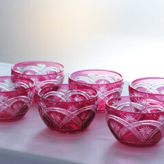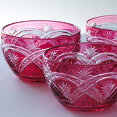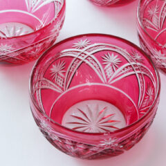 フランスより金赤の発色が非常に美しい3.5寸鉢が入荷しました。肉厚のガラスにエッジの立ったソリッドなハンドカットで装飾が施されています。直線と曲線を織り交ぜた高度なハンドカット技術は目を見張るものがあります。金赤の発色はアメリカやヨーロッパでは「クランベリーカラー」とも呼ばれ人気のある色味です。