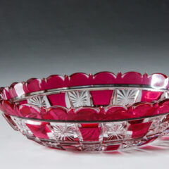バカラミュージアムの図録に同様の作品が掲載されており、1885年の作とされています。クリスタルガラスの上に薔薇をイメージした深紅の色ガラスを被せた後、ハンドカットを施すことで文様を浮き彫りにしています。