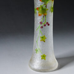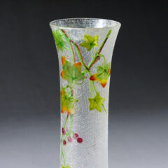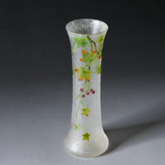 バカラの可愛らしいサイズの一輪挿しが入荷しました。エッチングで図柄を浮かび上がらせ、葉と木の実を透明感のあるエナメル彩で描いています。ガラス素地の地模様は木の実のようなデザインが入っており、ボディ全体はつやを消したフロスト仕上げ。可愛らしいサイズですので置き場所を選ばず、何気に飾れるのもオススメポイントです。バカラのアール・ヌーヴォー期のエナメル作品は割合肉厚にエナメルが焼き付けられていることが多く、光を通さないことが多いですが、本作品は薄手かつ淡くエナメル彩が施されていますので、透過性があり、より柔らかな印象を受けます。