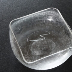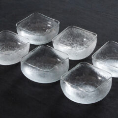 器型は型吹き成型で作られており、独特の曲線が美しい器です。そのため器にはそれぞれ多少の個体差があり、機械成型では成しえない味わい深さがございます。何度か取扱いのあるシリーズで、淵部分に金彩が入っているお品もございます。過去販売させて頂いたお品はお料理屋さんでもお使い頂いておりまして、プロユーザーの目線でも非常に使い勝手の良い器かと。先付けや向付の器、あるいはデザート用の器としても良いサイズでしょう。