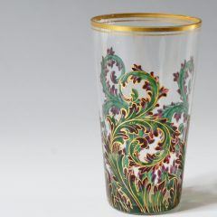 アンバー色のガラスに金彩とエナメル彩色で草花が描かれています。