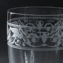 バカラの''CYGNES'' シーニュのゴブレットグラスが入荷しました。使い勝手抜群のウォーターグラスサイズ。普段使うとなればなんだかんだと容量200mlのグラスを良く使います。''CYGNES''とはフランス語では「白鳥」を意味し、読んで字の如くといったところでしょう、デザインにも白鳥があしらわれています。バカラのデザイン名はフランスの地名や人物名からとったものが多いですが、直球的なネーミングは新鮮なように感じます。グラス上部のみの装飾ですっきりとしたデザインですが、柄をよく見ると白鳥だけでなく双耳の壺が描かれ、植物のリース中央に星、四つ葉のクローバーなどなかなか凝ったデザインがエッチングであしらわれています。