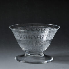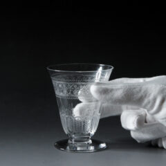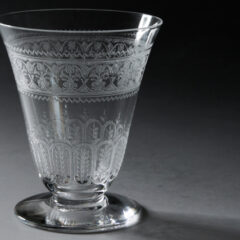 長年デザイン名の判別に苦しんでいましたが、ようやく判別しました!その名もセギュール ''SEGUR''。セギュールとは南仏エリアに位置する町の名称で、ワインの産地であります。葉の文様がガーランド状に入ったデザインで、ボール部の上下に異なる図柄が描かれた珍しい仕上げです。エッチングの彫りは深く、パルメやセヴィーヌの深さと同等です。中々マーケットに出てこないデザインのようで、弊社では5年スパン程度で巡り合っています。(前回入荷は5年前でした)当初のバカラのカタログ上では赤ワイン用のグラスのサイズです。