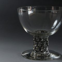 幾何学的なモチーフがスマートな印象の''SAINT-NABOR''のグラスが入荷しました。ラリックが1926年にデザインを手がけたシリーズで、カタログレゾネによるとシャンパンクープのサイズです。幾分口径が広がった形状ですので器としてもお使いいただけます。ラリックがデザインを手がけたグラスシリーズには珍しく、黒エナメル彩色が施されています。
