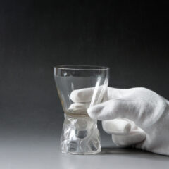 葡萄の実と蔓がモチーフになっており、全体をフロスト加工して実の部分のみ磨きを入れることで、美しい光沢を生んでいます。容量:約 90 ㎖程度で、白ワインなどに最適な小ぶりなグラスです。