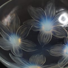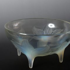 1924年にリリースされた装飾鉢「ユリ」。非常にユニークな形状をした鉢で、ユリの花が4つ寄り添うようにデザインされ、4本それぞれの花芯が下まで伸びた4脚鉢の仕上がりとなっています。ラリックの装飾鉢シリーズは古くは1913年~最終1943年まで様々な作品が製造されていましたが、このような脚高かつ4脚で立つようなデザインの鉢はこのユリ鉢のみです。