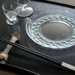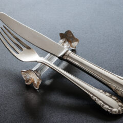 プレス成型とは言えど、凝った作りのナイフレストはさすがラリックのデザインだなという印象です。ラリックは全9種のナイフレストのデザインを手がけ、1919年に「蔦の葉」を含めた造形の特に美しいナイフレストを3種発表しています。