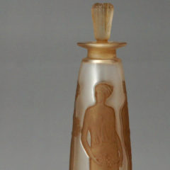 しばらく状態の良い個体の出会いがなく、久しぶりの入荷です。コンディション非常に良く、オリジナルのパチネ彩色も綺麗に残っています。古代の「龍涎香(りゅうぜんこう)」を意味する名前のコティ社のオリジナル香水のためにデザインされた作品。香水に芸術的イメージを与えるために、古代ローマの衣装をまとった女性像をあしらい、新古典調のデザインに仕上げてある。花束を手にした人物は、それぞれポーズが異なる。ラリック作品群においてはかなり初期にデザインされた作品で、アール・ヌーヴォーらしい優雅なデザイン。アンブル(英アンバー)は「琥珀(こはく)」という意味もあり、水溶性の顔料による表面着色(パチネ)で琥珀色に仕上げられている。細長いシルエットに刀の鍔(つば)のような幅広の口縁の付いたこの形は、古代の香油瓶によく見受けられる。コティ社の中ではかなり人気のあった香水瓶で、龍涎香(りゅうぜんこう)とは、マッコウクジラの腸内に発生する結石で、非常に貴重な最高級の香料です。甘く土のような、パウダリーで海風を感じさせる香りが特徴。長年海を漂流することで成熟し、香水や香料、古代には薬として珍重された「海の宝石」とも呼ばれます。