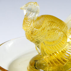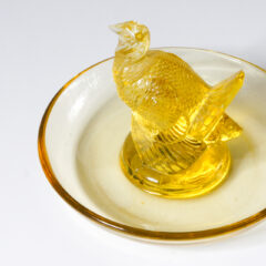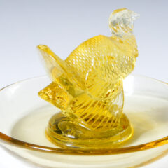 アール・デコスタイルにデフォルメされた七面鳥がモチーフになったピントレイ。1925年にリリースされた作品です。クリアガラス、オパルセントガラス、色ガラスのバリエーションで製造されていたモデルで、今回の入荷は珍しいイエローの色ガラスで製造された個体です。上部に動物のフィギュア、下部にトレーがついたデザインのピントレイは確認できるだけで16種ありますが、その中の1種。七面鳥のピントレイは同デザインで印章もリリースされています。