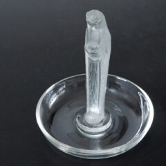インク瓶や印章、灰皿などのデスクまわりの小物類は昔から男性向けの趣味的アイテムとして工芸家が制作に力を注ぎ、コレクションの対象になっていました。丸い受け皿の中心に人物や動物の小彫刻を溶着した灰皿は、当時のラリック社オリジナルの形状で、モチーフを変えて30種程のモデルがデザインされました。所謂「灰皿」然とした形状ではなく、どこか愛らしさを感じるこれらの灰皿は一説によると女性向けにデザインされたとも言われています。1920年代頃、女性が社会進出をしていく中、働く女性がタバコを嗜むようになり、女性顧客にも親しんでもらいやすいデザインを考案したのではないでしょうか。