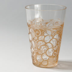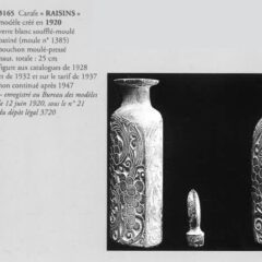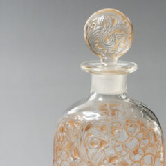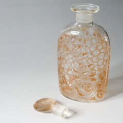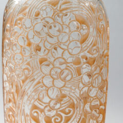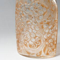 葡萄モチーフの迫力あるデザインのカラフ。クリアガラスにフロスト加工、セピア色のパチネ彩色が施されています。ラリックの初期作品特有の渋い仕上がりの作品。グラスウェアの括りで紹介されているカラフのデザインは栓部や本体の下部分に少しだけ装飾が入るスタイルが多いですが、それらとは大きく異なり、本体部分にも大胆にブドウがデザインされた珍しい仕上がり。扁平型の器型で、表裏でデザインが異なります。表面には3房の葡萄、裏面には2房の葡萄が描かれています。