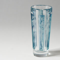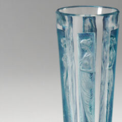 ラリックが1911年にデザインを手がけた''SIX FIGURINES'' 「6人の肖像」のゴブレットが入荷しました。アール・ヌーヴォー様式に則った6人の人物像が窓絵の要領で6面に渡って描かれています。よく見るとすべての人物像は表情と仕草が異なるようにデザインされています。初期のラリック作品らしく、クリアガラスにフロストガラス、パチネ彩色で色付けされています。ラリックというとアール・デコの印象が強いですが、1910年代に彼が手がけたデザインの中にはアール・ヌーヴォーの名残を感じさせるような作品がございます。国内外でも美術的評価が高い作品で、特に国内のラリック関連の美術展覧会などでは出品されることが多いお品です。また、同タイトルでカラフや花瓶もデザインされており、当時ゴブレットとカラフがセットで販売されていたという記録も残っています。小さなガラス表面にここまで精巧に型を出せる技術はジュエリー時代に鍛えられた金属加工技術の研鑽が大いに反映されており、ラリックの初期作品を語るうえでは外すことが出来ないマスターピースです。