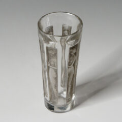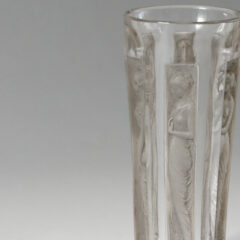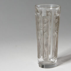 ラリックが1911年にデザインを手がけた''SIX FIGURINES'' 「6人の肖像」のゴブレットが入荷しました。アール・ヌーヴォー様式に則った6人の人物像が窓絵の要領で6面に渡って描かれています。よく見るとすべての人物像は表情と仕草が異なるようにデザインされています。初期のラリック作品らしく、クリアガラスにフロストガラス、パチネ彩色で色付けされています。ラリックというとアール・デコの印象が強いですが、1910年代に彼が手がけたデザインの中にはアール・ヌーヴォーの名残を感じさせるような作品がございます。国内外でも美術的評価が高い作品で、特に国内のラリック関連の美術展覧会などでは出品されることが多いお品です。また、同タイトルでカラフや花瓶もデザインされており、当時ゴブレットとカラフがセットで販売されていたという記録も残っています。小さなガラス表面にここまで精巧に型を出せる技術はジュエリー時代に鍛えられた金属加工技術の研鑽が大いに反映されており、ラリックの初期作品を語るうえでは外すことが出来ないマスターピースです。