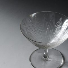 ラリックがデザインを手がけたグラスはボール部分に装飾入れず、ステムに装飾を入れたデザインが多いですが、ボール全体に蓮の葉がデザインされた作品は珍しいです。シャンパンを楽しむための口が広がったクープ型のグラス。