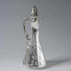 アール・ヌーヴォーとアール・デコの融合。流れるような曲線と細かな描写で描かれた図柄とシャープで直線的な器型のコンビネーションが非常に美しいリキュールボトル。オーバーレイの仕上げは十分な厚みがあり、初期手の作品であることがわかります。厚くコーティングされたスターリングシルバーに手彫りの装飾が加わり、美しい陰影を感じられる上質な仕上がりのリキュールボトルです。