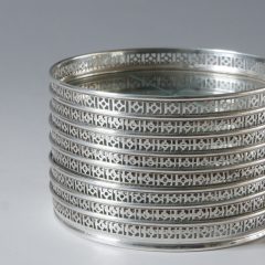 銀巻き技法のひとつで、特殊な電熱処理によって銀板の文様が厚くガラスや陶磁器に巻き付くまで析出させた装飾技法。