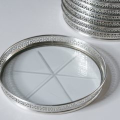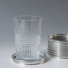 底部にハンドカットを施した丸ガラスにスターリングシルバーのリムを取り付けたコースターセットです。