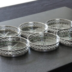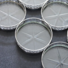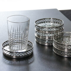 底部にハンドカットを施した丸ガラスにスターリングシルバーのリムを取り付けたコースターセットです。
