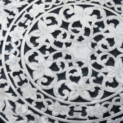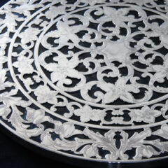 シルバーオーバーレイとはアメリカで1910年代~1930年代頃に流行した装飾技法です。銀巻き技法のひとつで、925グレードのスターリングシルバーを特殊な電熱処理によって銀板の文様が厚くガラスや陶磁器に巻き付くまで析出させた装飾技法です。分厚くシルバーオーバーレイが施されたお品には、線彫りの彫金を施したものも多くみられます。もともとはヨーロッパで開発された技法であり、カップなどの陶磁器に施したものが多かったですが、アメリカでは特にガラスに施され、アメリカ独自の工芸品として当時の上流階級の人々に楽しまれていました。
