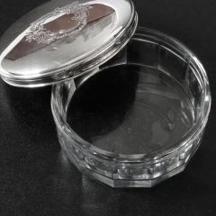 銀の輝きが際立つシンプルな蓋には手彫りで装飾が入っており、またガラス本体は大変厚みがありカットも入っているため高級感があります。