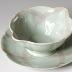 青磁を思わせる仄かなグリーンのボディーに、リボンのようなラインを重ね合わせた装飾が描かれています。