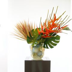 花材:コンシンネ(レインボー)、ヘリコニア、モンステラ