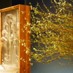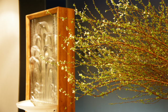 小さな白い花が咲き乱れるユキヤナギ。奥に映るのはラリックの噴水モチーフの装飾パネルです。
