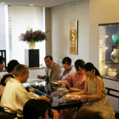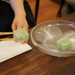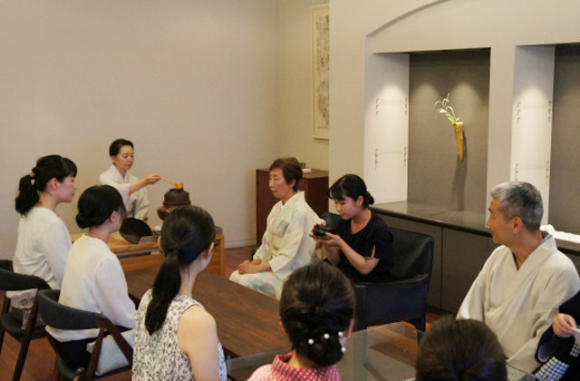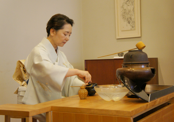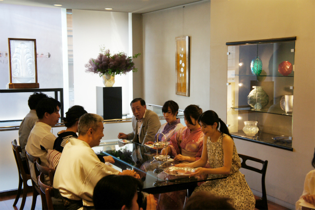 七夕前夜の7月6日、ギャルリーオルフェにて「ルネ・ラリック 見立ての道具」をテーマに、 武者小路千家官休庵正教授・野津手妙節さんによる茶会が催されました。