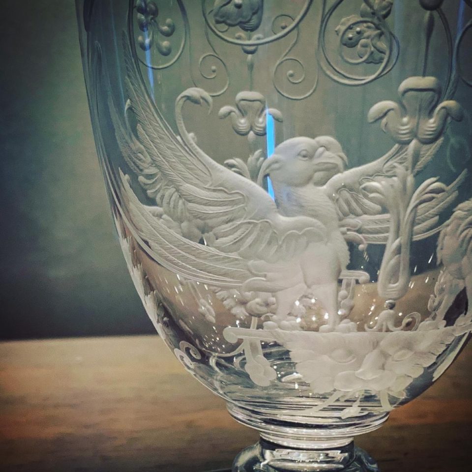 バカラのとてつもない作品が入荷しました。タイトルにもあるように、1878年パリで開催された万国博覧会にバカラ社が出品していた作品と同モデル、同デザインの作品です。ルネッサンス様式の意匠は全てハンドグラヴィールで彫り込まれています。栓部、ボディ、フット部全て型吹き成型で作られた軽やかなデザインです。