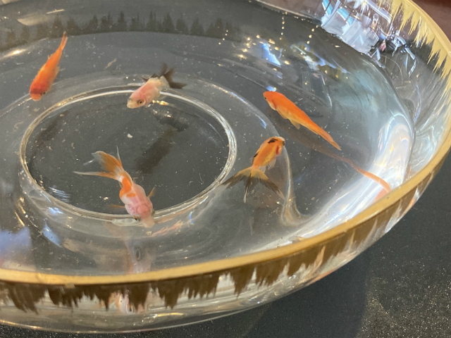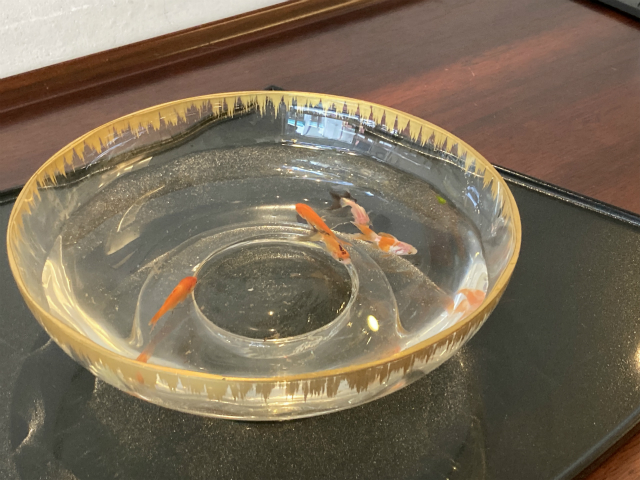 金彩の器に金魚の赤がとってもよく映えてくれました。