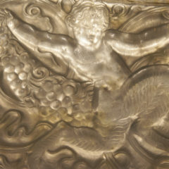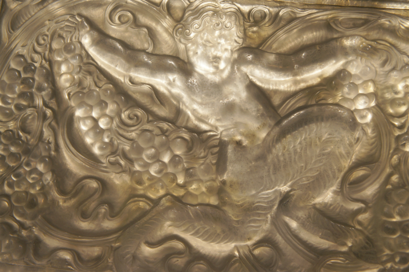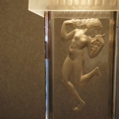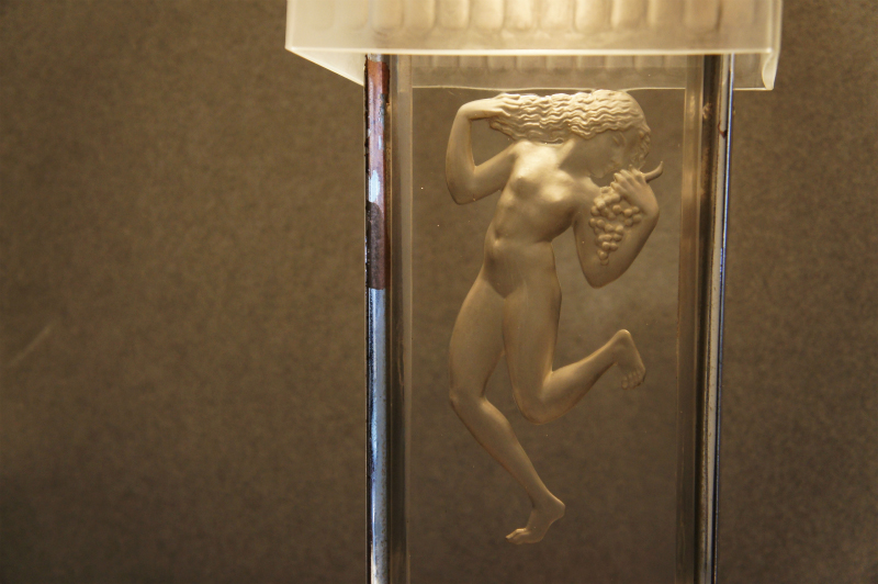 装飾パネル「牧神と葡萄」は、壁面に埋め込むためのガラスパネルで、裏面は鏡張りになっており、きらきらとガラスのレリーフが輝く仕組みです。